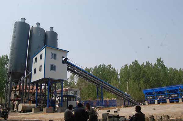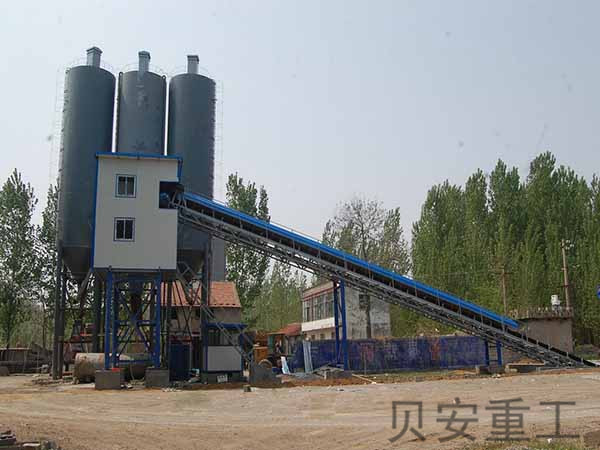 泰安HZS60混凝土攪拌站工地現場:骨料上料采用小傾角帶式輸送機,壽命長,工作效率高。